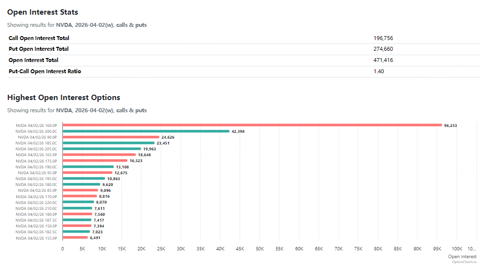 未平仓合约数据揭示了一个值得高度关注的现象:在4月2日到期的合约中,行权价160美元的看跌期权(Put) 积累了高达96,253份的未平仓头寸,远超其他任何单一合约。