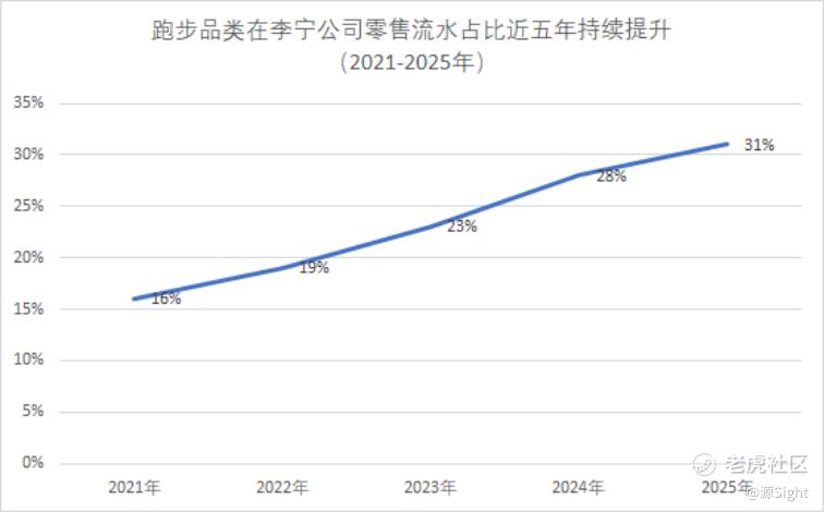 数据显示,2025年,李宁跑步品类流水同比增长10%,从2021年的16%到2025年的31%,流水占比连续5年提升,跑步跃升为李宁第一大品类。