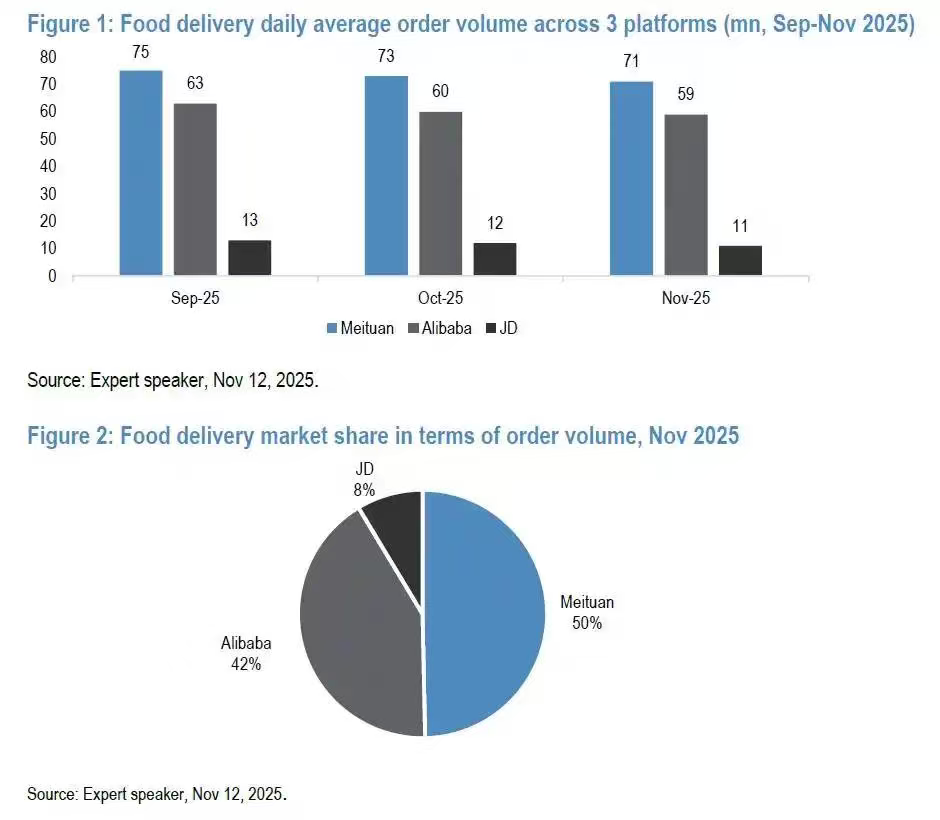 摩根大通11月调研数据显示,从订单量看,美团、阿里、京东三家份额分别为50%、42%和8%。
