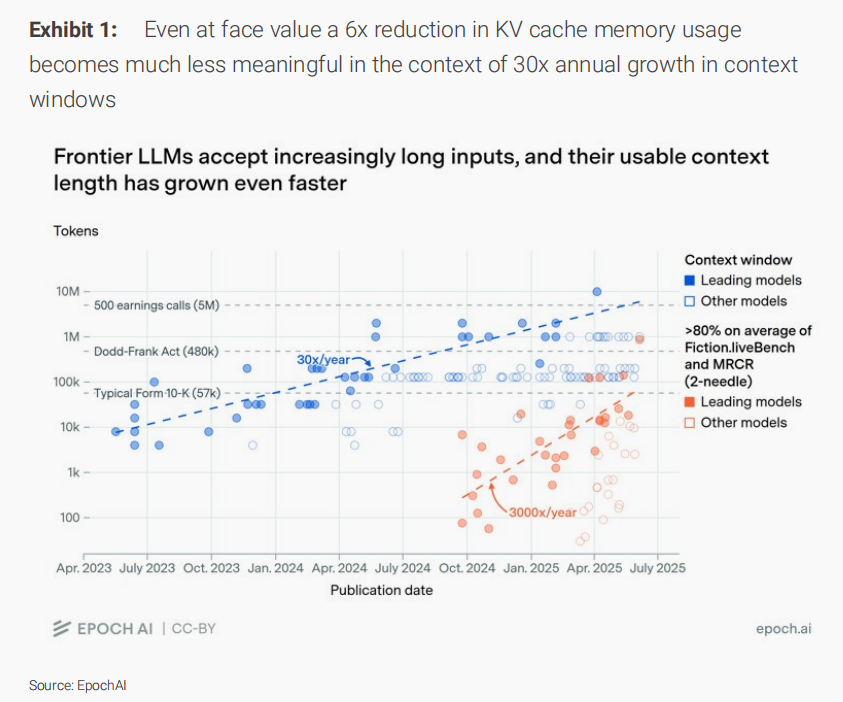 我们在今天与业内相关人士就此交流后得出的看法是,这对内存而言是一项渐进式的发展,基本没有意外。内存使用量是人工智能性能的关键决定因素之一,这使得内存成为渐进式改进的关键方面。当然,谷歌是该领域最具创新力的公司之一,因此一项增量改进并不特别令人意外,而且根据我们的联系人透露,KV缓存的压缩算法多年来一直是关注焦点——“最大的改进并不会宣传”,因为它们可以成为业务中的竞争优势。同样值得注意的是,谷歌的Gemini 3和2.5 Pro模型具有100万词元的上下文窗口,但公司已披露他们曾用Gemini 1.5 Pro测试了高达1000万词元,效果很好,但选择不发布该模型,部分原因是推理成本(。因此,我们预计,随着此类及其他创新带来的成本下降,资源将被用于提供更高智能、计算更密集的产品。