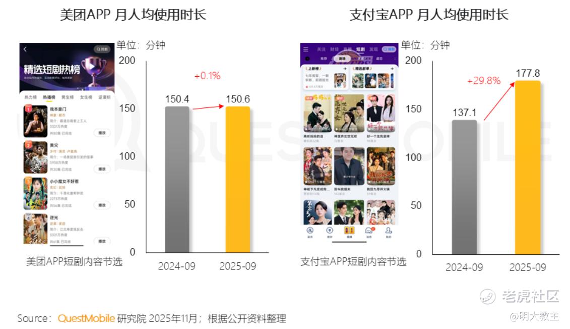 QuestMobile去年的研报显示,或因美团是原外卖既得利益者的原因,在采取同样短剧营销的策略下,美团MAU仅微增0.1%,反观支付宝增长了29.8%。