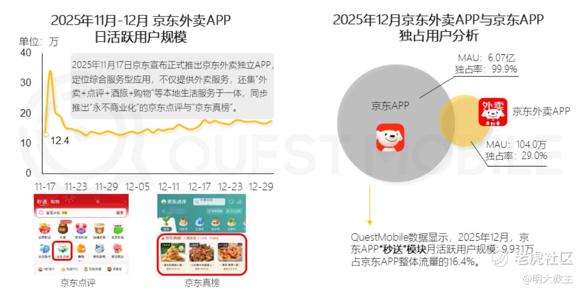 但据QuestMobile调研显示,京东外卖APP只有少量用户与京东主APP重合,且京东“秒送”模块月活用户只占了京东APP整体的16.4%。待京东主站向外卖业务逐渐导流,确实可在一定程度上达到减亏与份额提升双赢的目的。