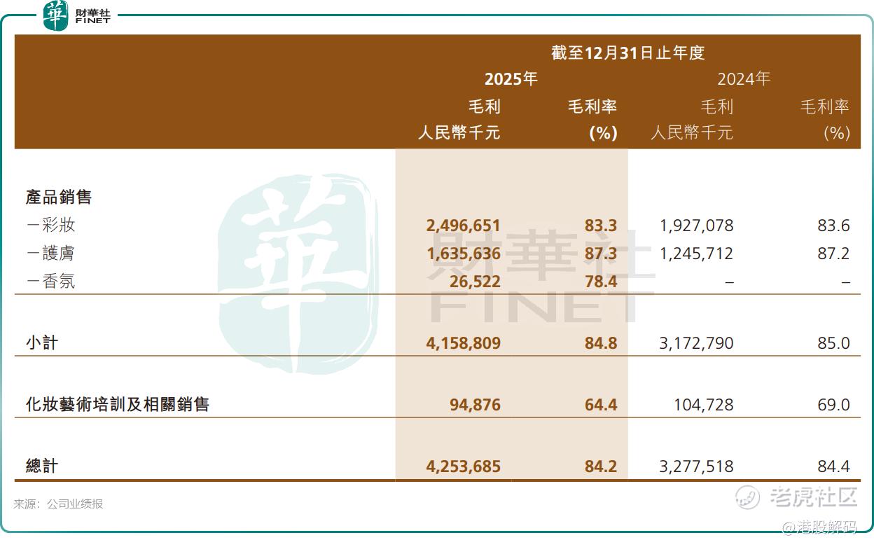 2025年,毛戈平的毛利率达84.2%,净利率也提升至23.9%。这是一个什么概念?对比来看,这一毛利率水平不仅显著高于 $珀莱雅(603605)$ 、 $上美股份(02145)$ 等国货同行,甚至已逼近或超过部分国际一线奢侈品美妆品牌。