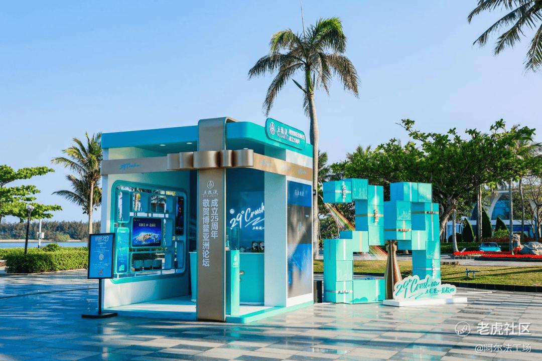 户外品牌快闪店以五粮液·一见倾心的天青色为基调,整体外观呈现为打开的礼盒形态,29个成员国的标志性建筑剪影融入“29”组合礼盒内,既呼应了博鳌亚洲论坛的国际化属性,又将五粮液的“和美”文化转化为可感知的场景体验,让其有了更具体、更生动的落脚点。