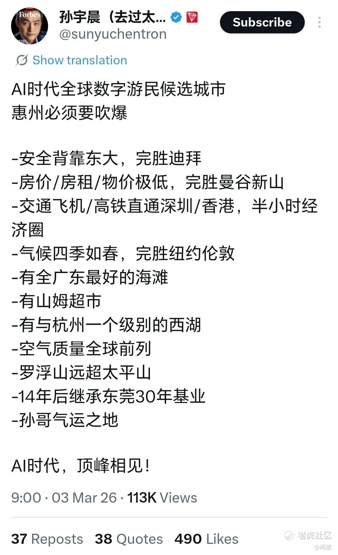 原因是3月初,“币圈大亨”孙宇晨发了一条推文,把惠州捧成了“AI时代全球数字游民候选城市”。
