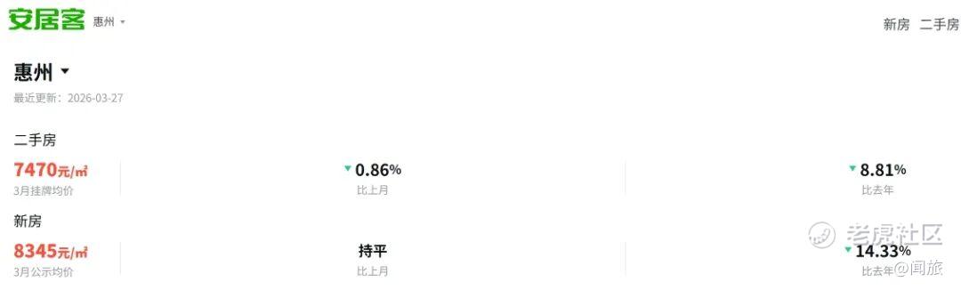 惠州3月份二手房挂牌均价7470元/平,环比跌0.86%,同比跌8.81%;