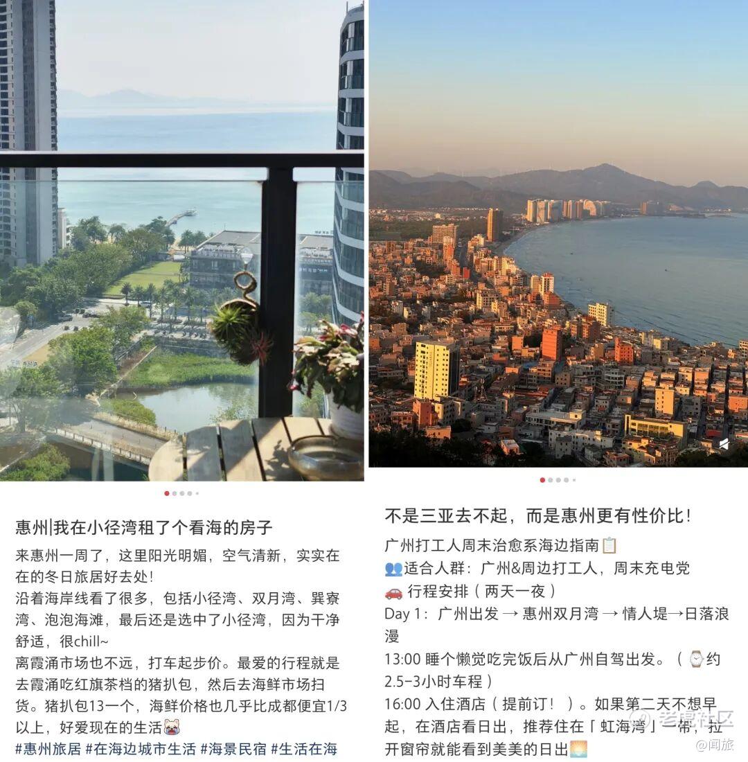 这不是个例。在小红书、豆瓣这类社媒上,“旅居圣地”“反向旅游圣地”已经成为惠州热门标签。有人专门跑去惠州吹着海风写毕业论文,有人把工作室搬到海边,还有人干脆退了深圳的房,在惠阳长租下来,每周去一趟公司开会。