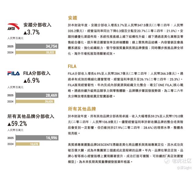 分开看,主品牌安踏2025年收入为347.5亿元,同比增长3.7%,经营利润同比增长2.5%至72.11亿元;FILA收入为284.7亿元,同比增长6.9%,经营利润同比增长10.1%至74.18亿元;包含迪桑特、可隆在内的所有其他品牌收入为170亿元,同比增长59.2%,经营利润同比增长55.3%至47.36亿元。