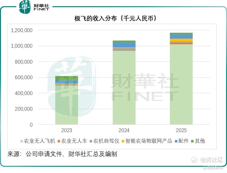 2023-2025年,极飞财务状况实现跨越式好转,增长势头十分强劲:2023年公司仍处亏损,全年营收6.14亿元,经调整净亏损1.36亿元;2024年营收突破10亿元大关,达到10.66亿元,同比大增73.40%,成功扭亏为盈,录得经调整净利润7,196.8万元;2025年营收进一步增长至11.66亿元,同比增长9.45%,经调整净利润飙升至1.38亿元,同比大增91.21%,利润率持续走高。