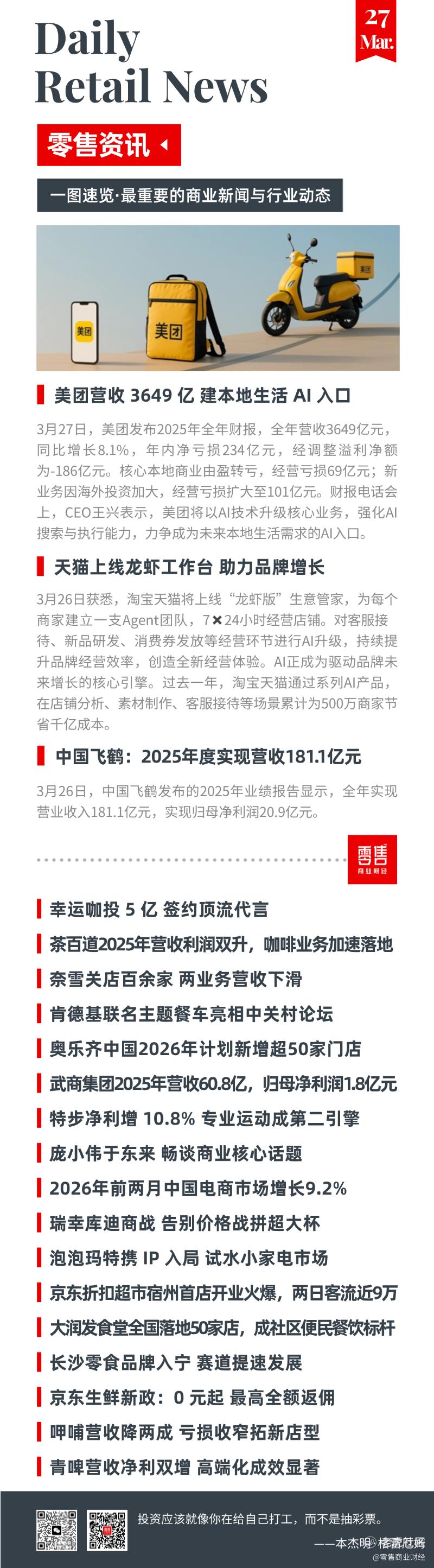 3月27日,美团发布2025年全年财报,全年营收3649亿元,同比增长8.1%,年内净亏损234亿元,经调整溢利净额为-186亿元。核心本地商业由盈转亏,经营亏损69亿元;新业务因海外投资加大,经营亏损扩大至101亿元。财报电话会上,CEO王兴表示,美团将以AI技术升级核心业务,强化AI搜索与执行能力,力争成为未来本地生活需求的AI入口。