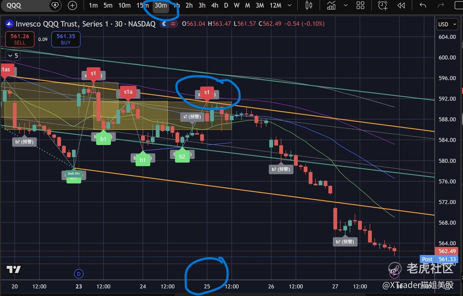 我们的禅动买卖点指标QQQ 30F周三出了卖点确认后一直没出现买点,我个人操作比它晚一点,周四才清到底仓+做空对冲,原因是这轮大盘回调但强势标的都非常强,包括周五今天的部分个股居然还在8日线和21日线上。