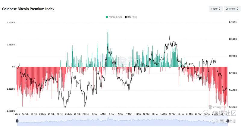 看到个消息,据 Coinglass 数据显示,自3月19日以来,Coinbase 比特币负溢价趋势扩大。同期,比特币自 7.4 万美元回落至目前的 6.6 万美元,证明本轮回调由美国投资者主导。