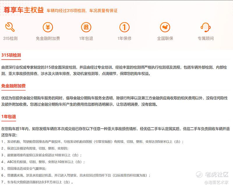 最近是315消费者权益日,优信周五收盘刚好收在3.15,这数字巧合真有点玄学味道。翻了翻优信在消费者保障上的动作,确实比路边小车商靠谱太多。优信这边的承诺很实在:每台车都经过315项专业检测才上架,重大事故、水泡、火烧、调表问题支持十年包退,普通车况也有7天无理由退换,外加1年/2万公里保修,这些售后保障都写进了合同,不是口头说说而已。