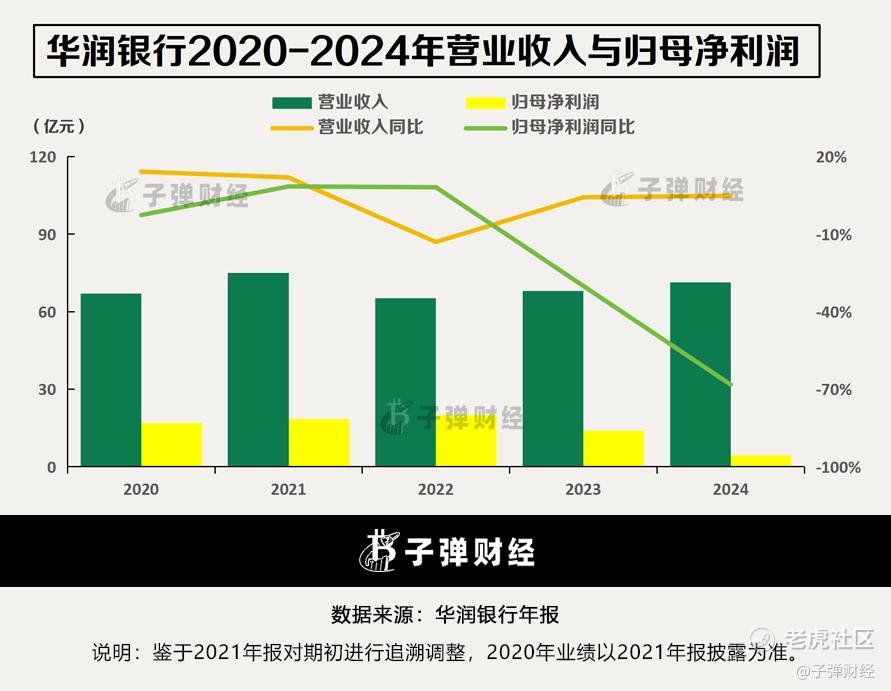 将时间往前倒推,2020年至2024年,华润银行的营收分别为66.99亿元、74.99亿元、65.23亿元、68亿元和71.32亿元,同比增速分别为14.19%、11.94%、-13.02%、4.26%和4.87%。