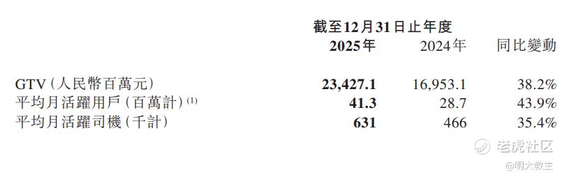 2025年曹操出行GTV增长38.2%至234.27亿元,营业收入增长37.7%至201.89亿元。