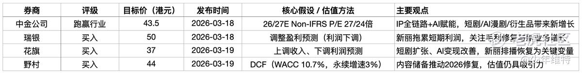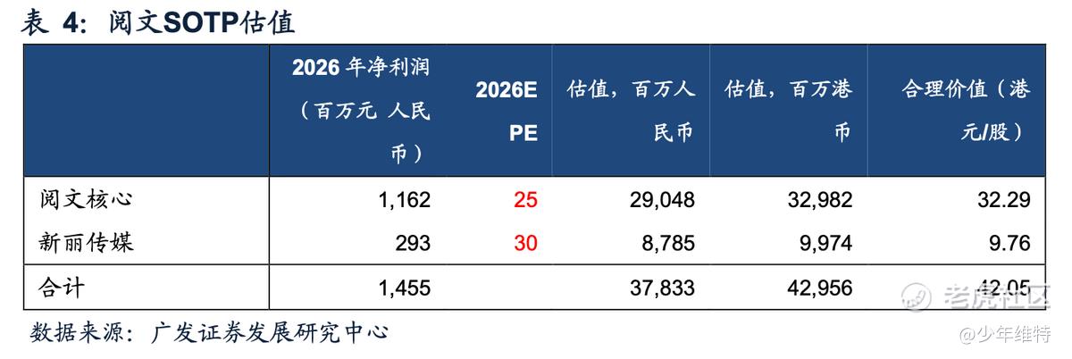 最新广发是用了SOTP拆分估值,预计26年归母净利润14.55亿元,对应目标价42.05港元/股。不算新丽,仅阅文核心业务给25倍PE,对应330亿港币。(IP业务相关公司2026年PE为15-25x区间,内容制作相关公司26年PE为22-48x)