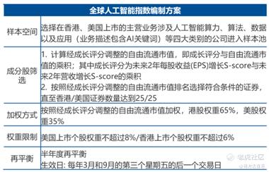 富时定制全球人工智能精选指数(FTSE Custom Global AI Select Index )精选在香港和美国上市的50只主营业务涉及人工智能算力、算法、数据及应用的公司股票,采用经成长因子调整的自由流通市值加权,使得成分股具备更良好的成长性和流动性。