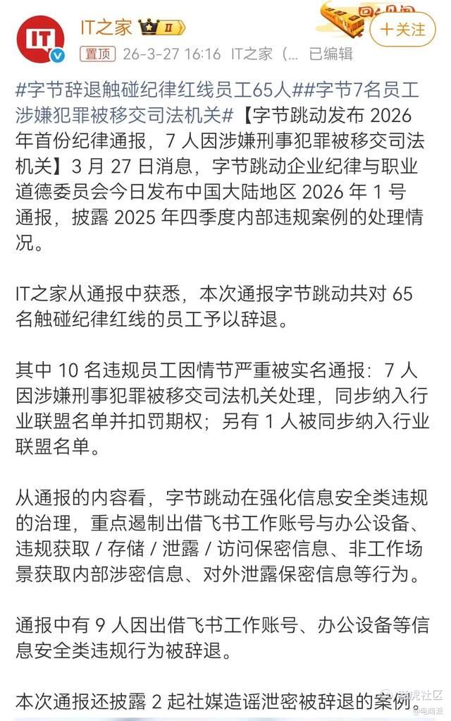 据行业消息,3月27日,字节跳动企业纪律与职业道德委员会发布中国大陆地区2026年1号通报,披露2025年四季度内部违规案例的处理情况。