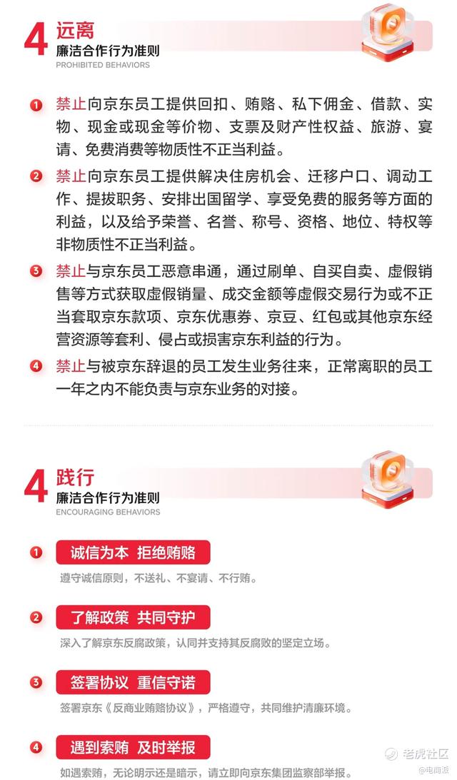 去年6月,京东还发布了一份《京东集团廉洁合作指南》,明确规定禁止向京东员工提供回扣、贿赂、借款、实物,以及旅游、宴请等物质利益,也禁止提供住房、户口、职务晋升等非物质利益。