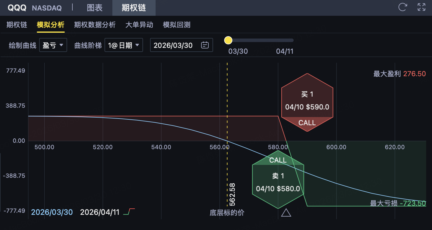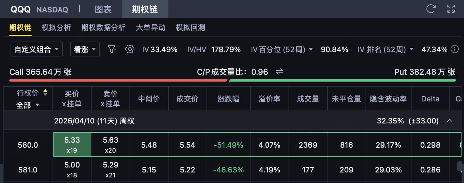 对应到 $纳指100ETF(QQQ)$ ,这意味着指数短线虽然可能出现技术性反弹,但若没有新的强催化,继续大幅向上突破的难度并不低。在这种背景下,如果判断QQQ到期前难以有效突破580—590美元上方压力区间,则可考虑构建580/590的熊市看涨价差策略,在控制上行风险的同时,通过收取权利金争取收益。