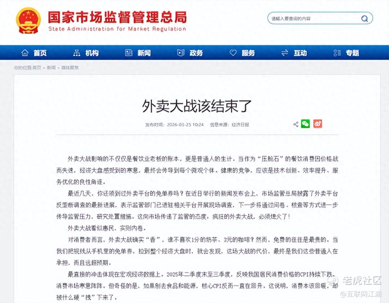 于是,一个最为恰当的时机,监管总局转发经济日报文章定调:外卖大战该结束了。