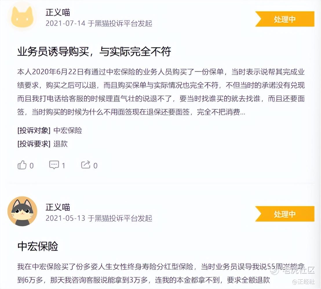 消费者方面,在黑猫投诉平台上,不乏“虚假宣传”“诱导投保”“拒绝理赔”方面的投诉。正经社分析师粗略翻阅,大量投诉都没有得到解决。甚至早到2021年,相关投诉仍然显示为“处理中”。