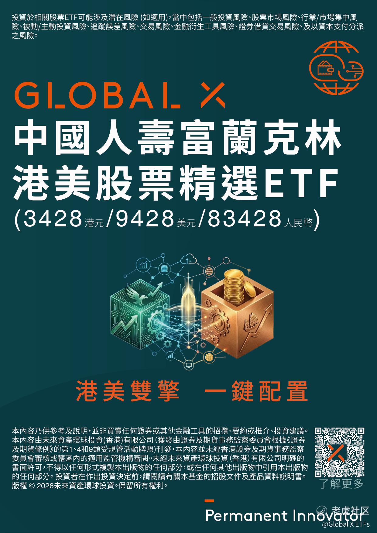 Global X 中国人寿富兰克林港美股票精选 ETF(3428 港元/83428 人民币/9428 美元) $GX国寿港美(03428)$ $GX国寿港美-R(83428)$ $GX国寿港美-U(09428)$ 结合港股高股息股票及美国龙头成长公司的双引擎策略,从港股通高股息企业及美股非金融龙头中精选45只证券,让投资者可透过单一产品同时布局港美两大市场。