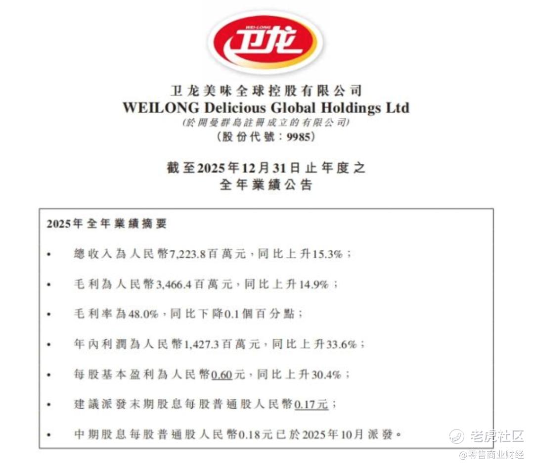 2026年3月26日,卫龙美味全球控股有限公司发布2025年全年业绩。财报显示,这家以辣条起家的公司全年营收72.24亿元,同比增长15.3%;实现归母净利润14.27亿元,同比大幅增长33.6%。