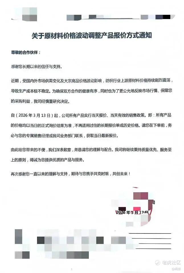 我一个做布草批发的朋友,两周前已经接到上游纱厂发来的调价函,上面写着:“即日起,所有产品实行当天报价、当天有效,价格以当日询价结果为准。”
