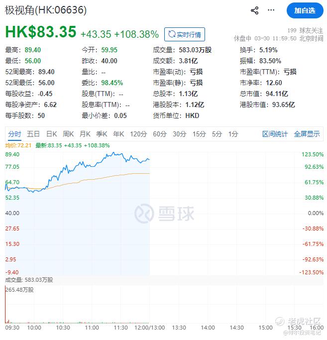 截至午间收市,极视角每股收报83.35港元,涨108.38%,总市值约94.11亿港元。