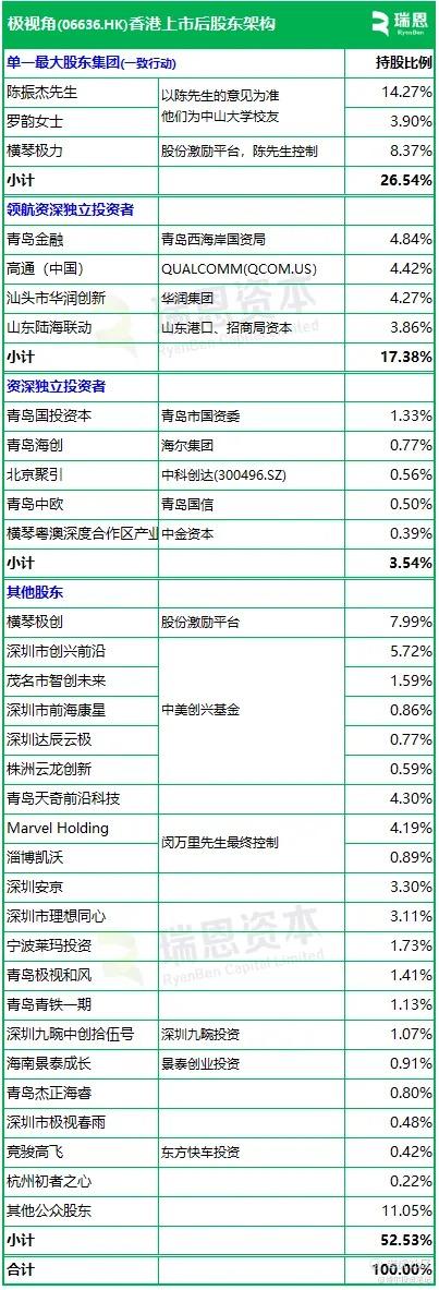 招股书显示,极视角在香港上市后的股东架构中,陈振杰先生、罗韵女士、横琴极力为一致行动人,合计持股约26.54%,为单一最大股东集团。领航资深独立投资者包括青岛金融、高通(中国)、华润创新、山东陆海联动,资深独立投资者包括青岛国投资本、青岛海创、中科创达(300496.SZ)、青岛中欧、横琴粤澳深度合作区产业投资等,其他投资者包括中美创兴基金、青岛天奇、Marvel Holding等。