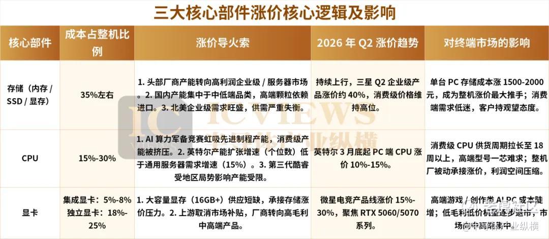 一台AI PC的整机成本,大半都集中在存储、CPU、显卡三大核心硬件上,每一类硬件的涨价,都有各自的产业逻辑,多方压力叠加,便形成了难以逆转的涨价合力。结合一线调研情况来看,这三大核心部件的紧缺周期还没见顶,成本上行的压力仍在持续向下传导,远未到拐点。