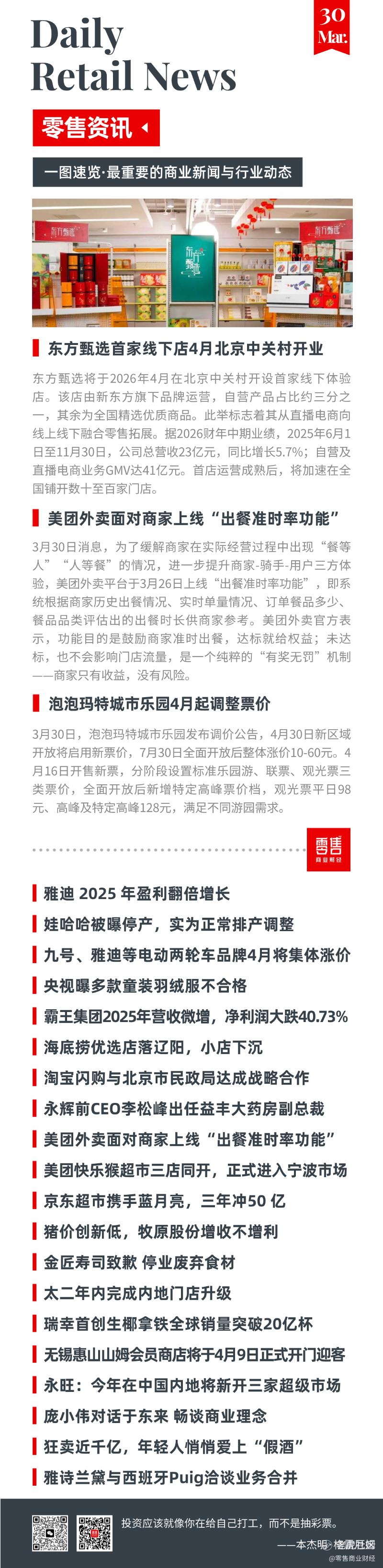 东方甄选将于2026年4月在北京中关村开设首家线下体验店。该店由新东方旗下品牌运营,自营产品占比约三分之一,其余为全国精选优质商品。此举标志着其从直播电商向线上线下融合零售拓展。据2026财年中期业绩,2025年6月1日至11月30日,公司总营收23亿元,同比增长5.7%;自营及直播电商业务GMV达41亿元。首店运营成熟后,将加速在全国铺开数十至百家门店。
