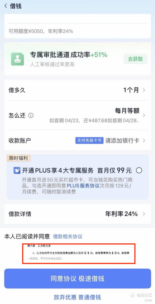 而为了规避法定的利率上限,助贷机构往往通过服务费、担保费等名目收取费用。例如,在借款页面,仅有一个狭长空间展示委托担保合同,非常不方便查看合同条款。且担保费金额、担保费费率均用“【/】”表示,并备注“一经收取,不予任何理由返还”,让用户在申请借款时,难以知晓具体费用。