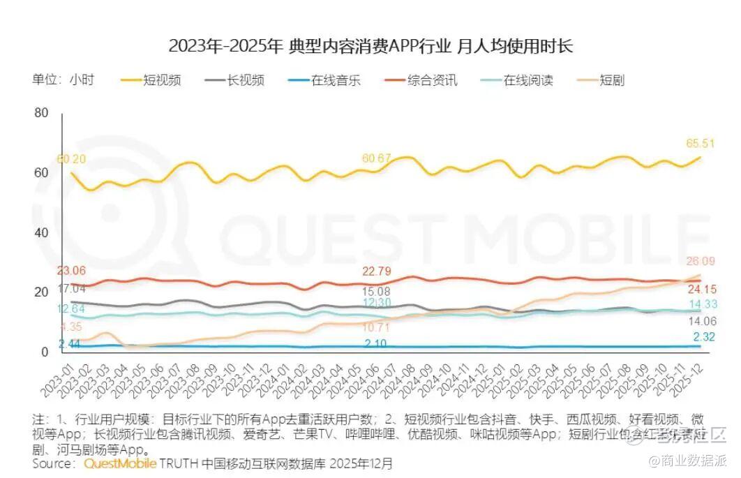 数据显示,2025年长视频的全网用户月均时长为14.06小时,和23年相比下滑了17.5%;而短剧则从4.35小时攀升至26.09小时。而短视频则仍以月均65.51小时的时长,持续高位领先。