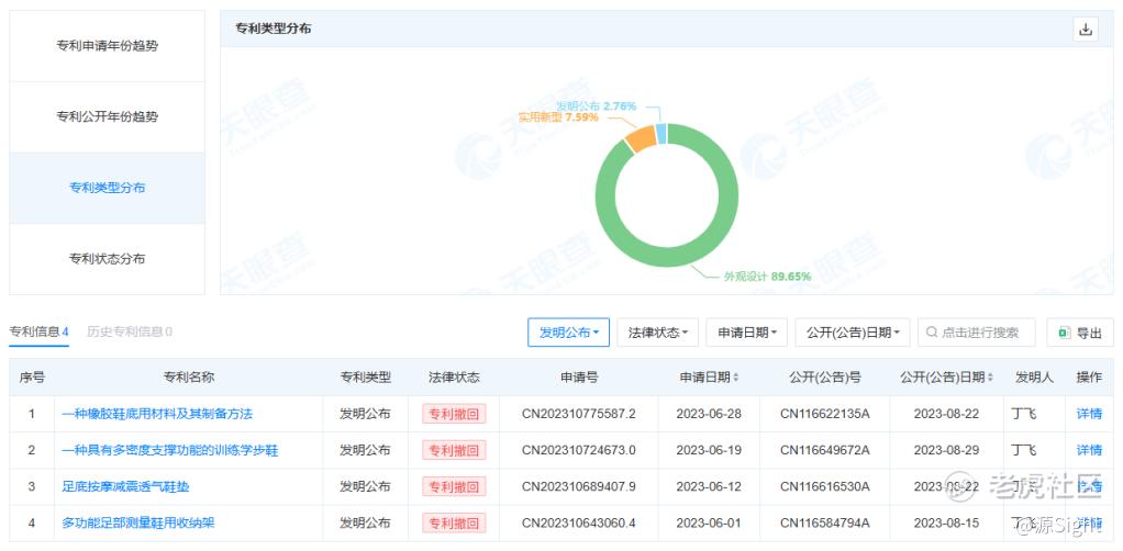 而号称堆砌了各种先进技术及材料、堪比“幼儿版萨洛蒙、On昂跑”的泰兰尼斯运动童鞋,在技术底蕴方面并不一定占有优势。据天眼查信息,其近150条的发明专利里,有130条属于外观设计,只有4条发明公布,且全部属于专利撤回状态。