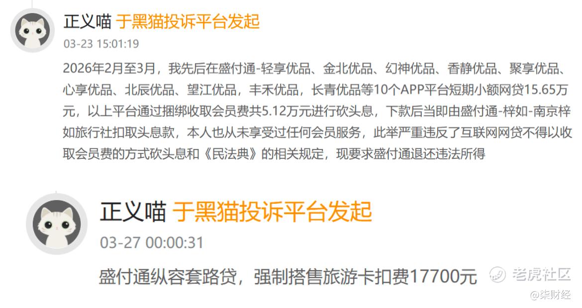 比如,用户反映:“2026年2月至3月,先后在盛付通-轻享优品、金北优品、幻神优品、香静优品、聚享优品等10个平台网贷15.65万元,以上平台通过捆绑收取会员费共5.12万元进行砍头息,下款后当即由盛付通-梓如-南京梓如旅行社扣取头息款,本人从未享受过任何会员服务……”