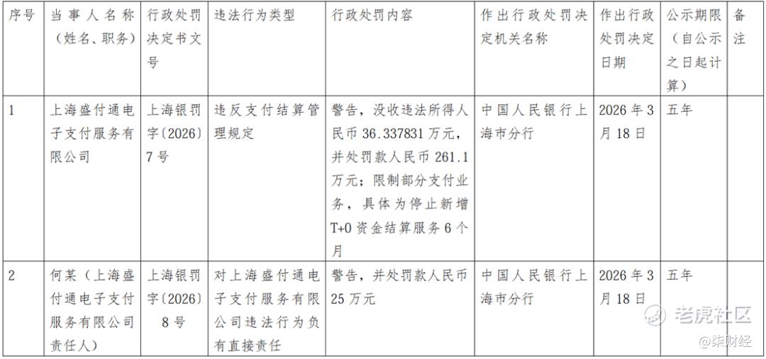 针对此次处罚,盛付通方面于3月26日发布公告回应称,该罚单系2025年7月1日至8月29日中国人民银行上海市分行对公司2024年7月9日至2025年6月14日期间支付结算业务的例行执法检查结果。