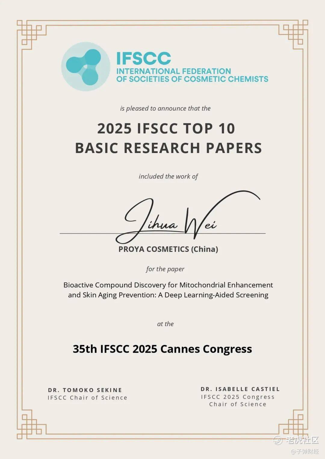 (图 / 珀莱雅荣获“2025IFSCC十大基础研究奖”)