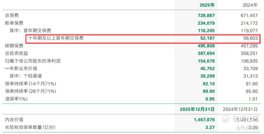《节点财经》注意到,在产品结构转型的同时,中国人寿传统业务面临增长压力。2025年,公司十年期及以上首年期交保费521.97亿元,同比下降7.78%。
