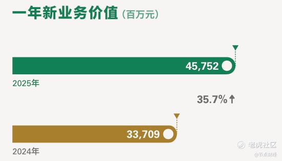 2025年,中国人寿一年新业务价值达457.52亿元,同比增长35.7%,增速为2017年以来新高。其中,个险渠道和银保及其他渠道的贡献分别为393亿元、64.5亿元,对应增速25.5%、169.3%。