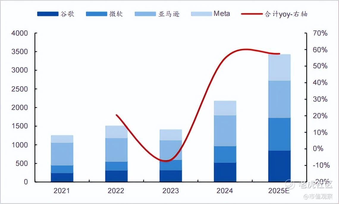 一是AI算力爆发带来的光芯片数量增长。近年来,下游云计算厂商资本开支不断攀升。微软、谷歌、亚马逊和Meta四家2025财年合计资本开支高达3500亿美元,同比增长约60%,为AI数据中心规模扩张提供助力,也将拉动光芯片出货量。