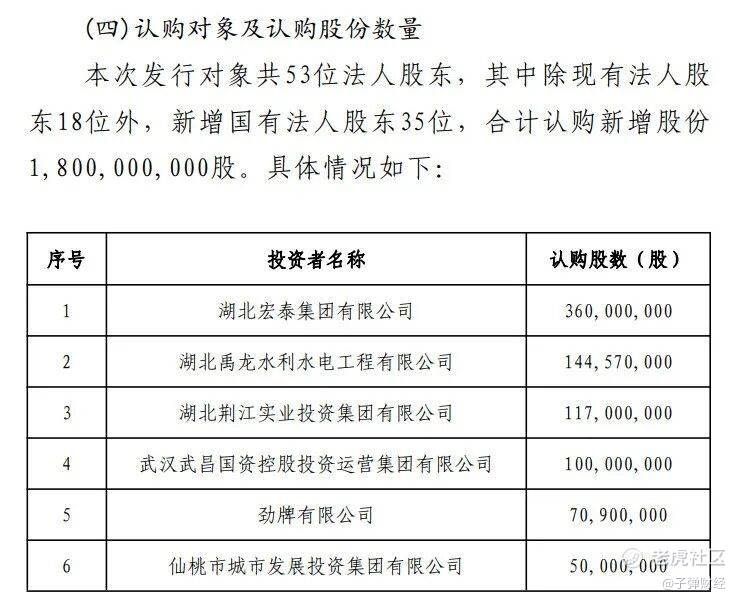 认购金额方面,湖北荆江实业投资集团以4.95亿元认购1.17亿股,成为认购金额最高的新股东;武汉武昌国资控股投资运营集团出资4.23亿元认购1亿股紧随其后;仙桃市城市发展投资集团出资2.12亿元认购5000万股。