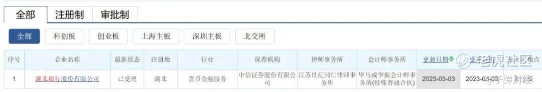 2022年11月,湖北银行向上交所递交上市申请,正式开启上市之路。2023年A股实施全面注册制,湖北银行切换至注册制审核。2023年3月,上交所受理了湖北银行的上市申请。