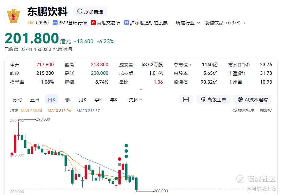 截至4月1日发稿,东鹏饮料A股小幅反弹2.5%,股价210.4元/股;H股股价回升至217.2港元/股。