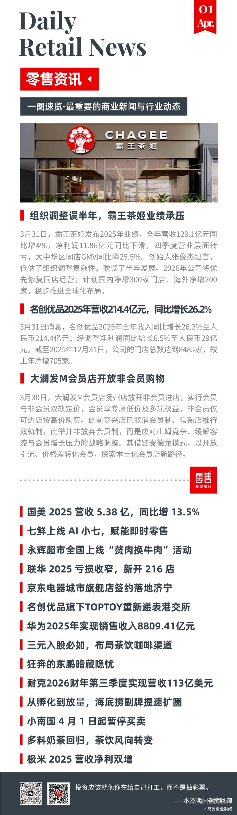 3月31日,霸王茶姬发布2025年业绩,全年营收129.1亿元同比增4%,净利润11.86亿元同比下滑,四季度营业层面转亏,大中华区同店GMV同比降25.5%。创始人张俊杰坦言,低估了组织调整复杂性,耽误了半年发展。2026年公司将优先修复同店经营,计划国内净增300家门店、海外净增200家,稳步推进全球化布局。