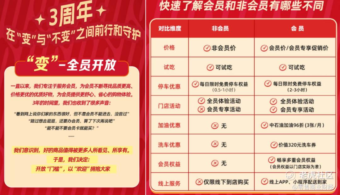 3月30日,大润发M会员店扬州店放开非会员进店,实行会员与非会员双轨定价,会员享专属低价及多项权益,非会员仅可进店按高价购买。此前嘉兴店已取消会员制、常熟店推行双轨制,此举并非放弃会员制,而是应对山姆竞争、缓解客流与会员增长压力的战略调整。其借鉴麦德龙模式,以开放引流、价格差转化会员,探索本土化会员店新路径。