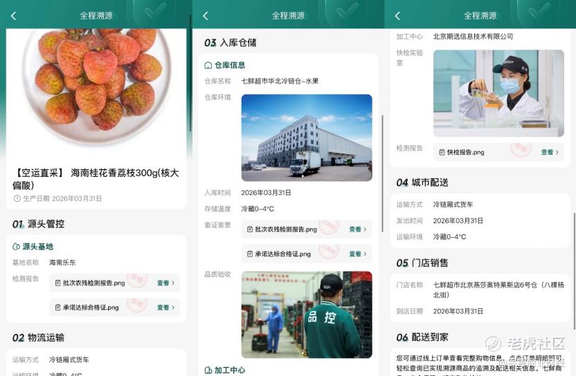 以海南桂花香荔枝为例,点击其商品页面的“全程溯源”,即可查看该批次商品从采收后初检、仓储复检到门店终检的三轮农残检测报告,运输方式、到店日期等信息也同步呈现。更具优势的是,这套溯源系统实现动态实时更新,每一批次水果的当日真实状态均可查询,彻底告别“溯源信息与实际不符”的行业痛点,让消费者买到的每一颗水果,都不是“盲盒”,而是有据可查的安心之选。