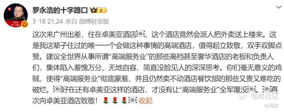 简单说就是,罗永浩去广州出差住卓美亚酒店,人家居然派人把外卖送上楼了。他发文感慨:“这是我这辈子住过的唯一一个会做这种事情的高端酒店。”