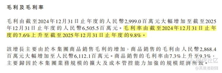 2025年,鸣鸣很忙的毛利率提升至9.8%,较2024年的7.6%提升了2.2%。